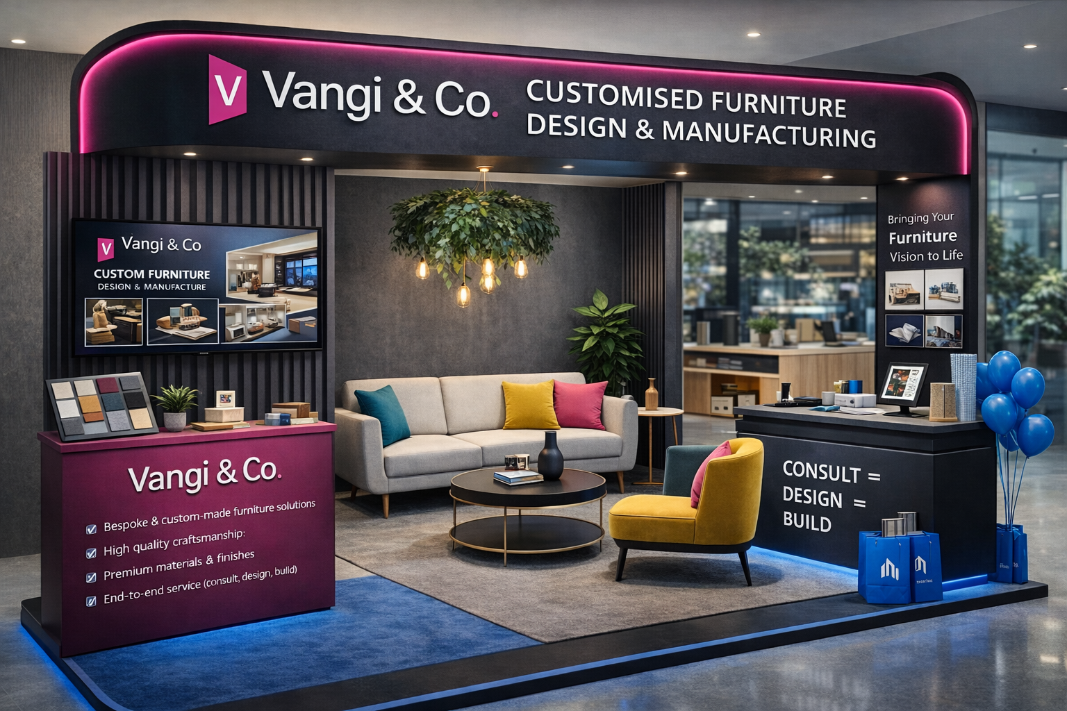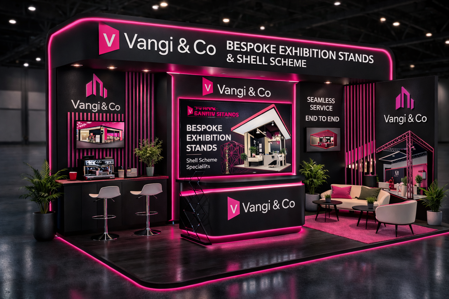 At Vangi & Co, we design and build custom exhibition stands that elevate your brand presence and attract the right audience. From fully bespoke structures to professionally upgraded shell scheme booths, we deliver powerful, visually striking exhibition environments that convert visitors into clients.